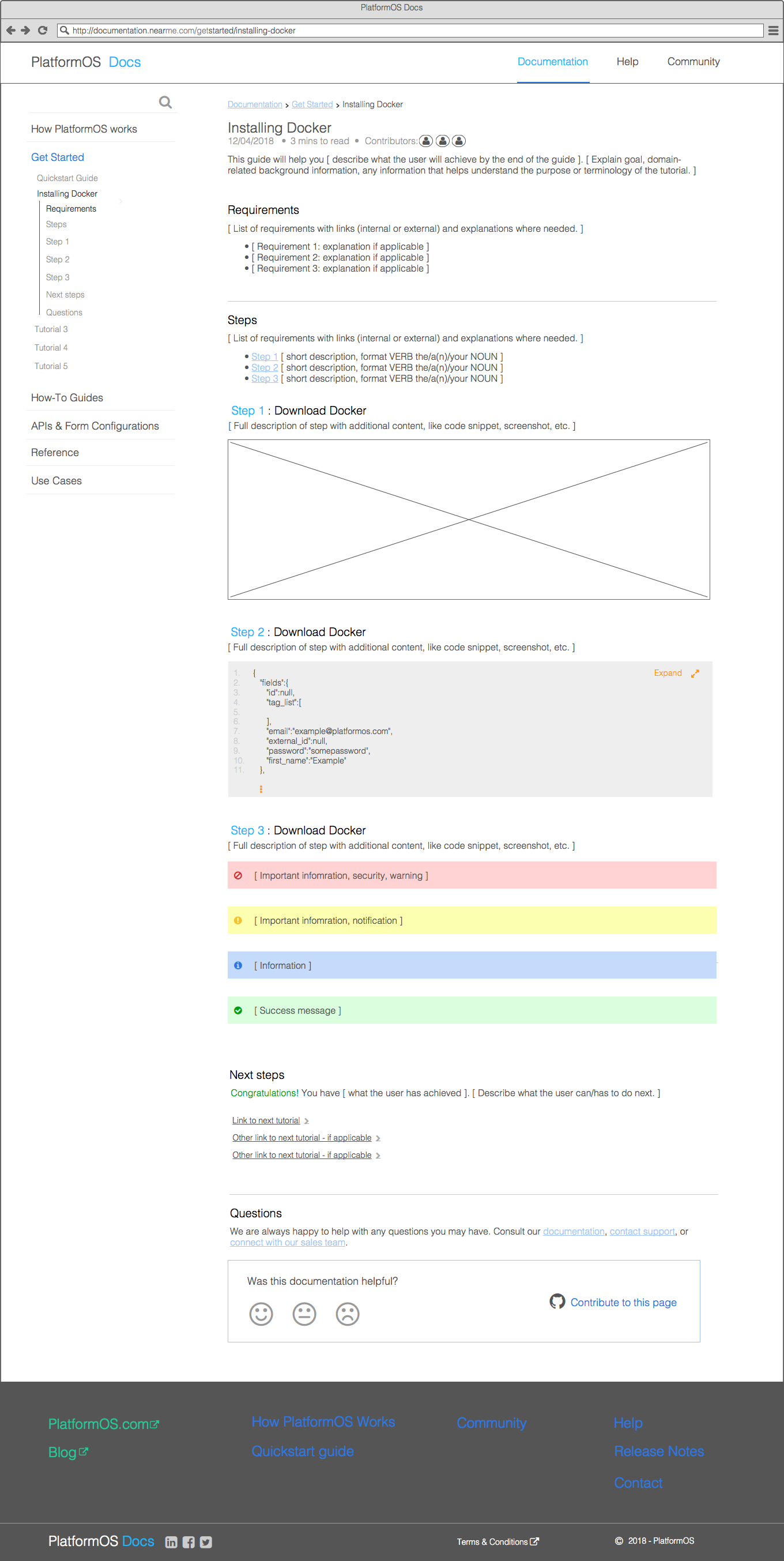 Our site uses Liquid pages, but to make editing easier for contributors, we write documentation content in GitHub Flavored Markdown and use a Markdown converter to turn it into Liquid. Our templates include all non-changeable content, and placeholders with explanations for the parts to add. Placeholders provide information on the recommended format (e.g. title), and any requirements or limitations (e.g. maximum number of characters). Recurring sections, like the question block at the bottom of each page, are added using a partial.
