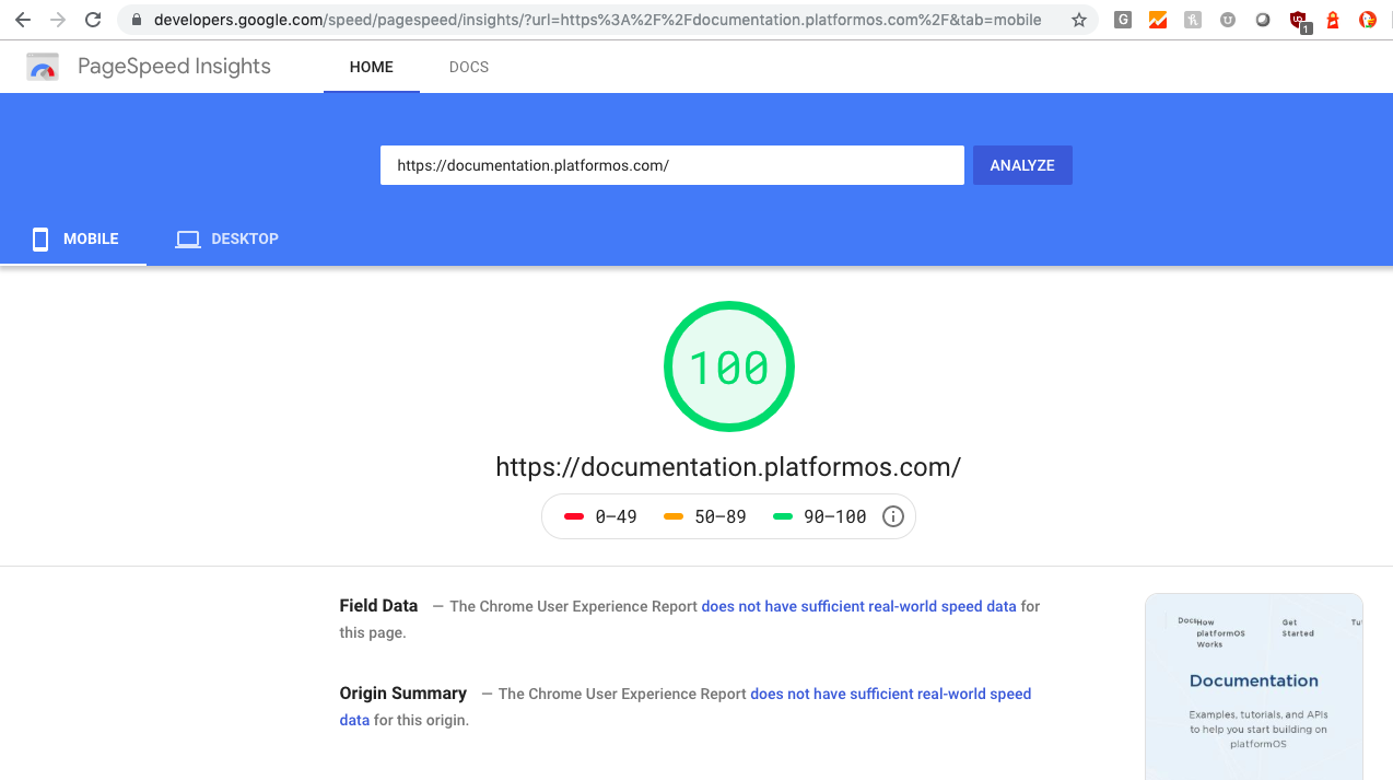 If you read our article about Code Quality and Performance Best Practices for Your platformOS Site, you know how good performance can help you keep visitors on your site, provide the best user experience, and rank high in search results. Our documentation is a high-performance site with a Google PageSpeed Insights score of 100 for both Mobile and Desktop, so we thought it could be helpful to dive a bit deeper into what tools we use and how we achieved this amazing performance.